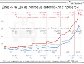 На вторичном рынке в нашей стране цены на легковые авто с конца 2021 года (за полугодие) выросли в половину + 50 % (см. диаграмму, источник Агентство аналитики ), особенно на машины возрастом до 7 лет выпуска. Рост цен наблюдается и по рынку новых машин, где цены измеряются уже только в млн. рублей.